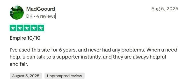 Aunque nadie puede cuestionar la legitimidad de este sitio web de juegos de juego de CSGO, ha recibido un éxito considerable en los 10 años que ha estado operativo. El puntaje TrustPilot de CSGoempire actualmente es de 3.6 estrellas. Algunos podrían considerarlo pésimo. Sin embargo, es un perfecto 5 para 7 de cada 10 usuarios.